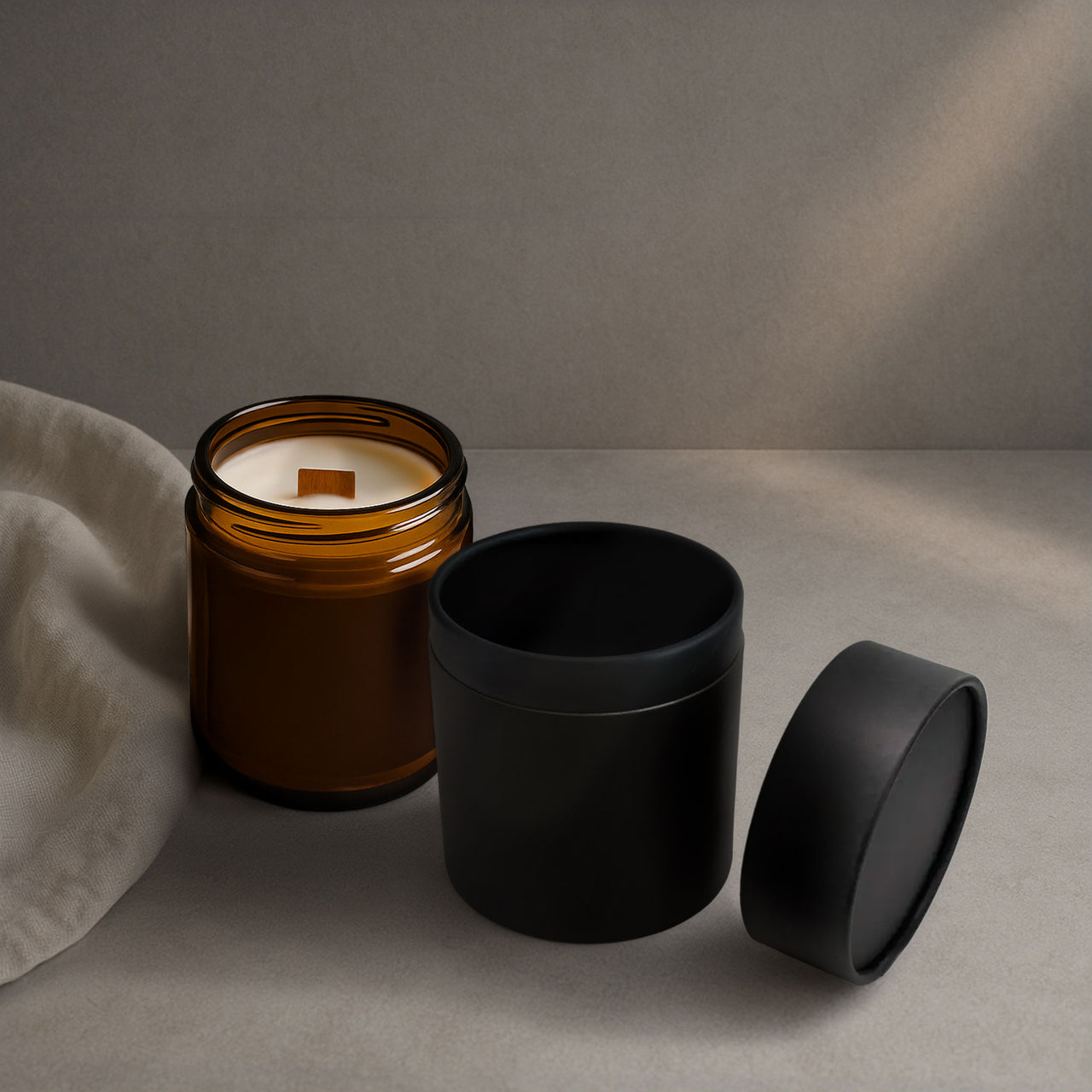 Our eco-friendly matte black candle tubes are designed exclusively for Candl•ogic’s 6 oz amber jar candles, delivering a thoughtful layer of protection and sophistication.